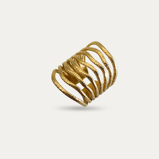 A beautifully textured gold ring that speaks for itself. Crafted from durable stainless steel and finished in a luxe gold plate, it's waterproof, tarnish-resistant, and fully adjustable for the perfect fit. With its bold, wide wrap design, this ring is made to stand out all on its own, no stacking needed. A perfect gift, or a little everyday statement just for you.