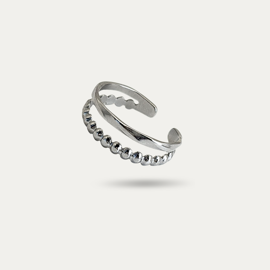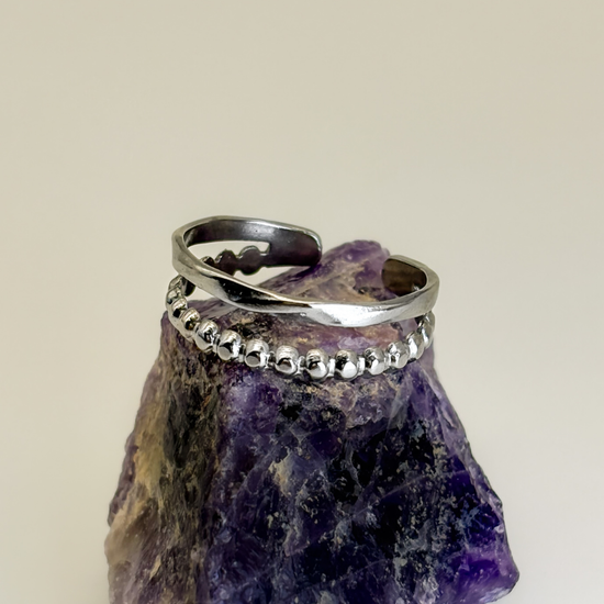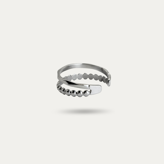 This Two-Band Silver Stacking Ring is a chic, versatile accessory for everyday elegance. Crafted from stainless steel, it’s waterproof, tarnish-free, and adjustable for a perfect fit. The open ring design features a dainty ball detail and a textured minimalist finish, making it ideal for stacking or wearing solo. Its simple yet modern style complements any outfit, adding a subtle touch of sophistication that lasts.